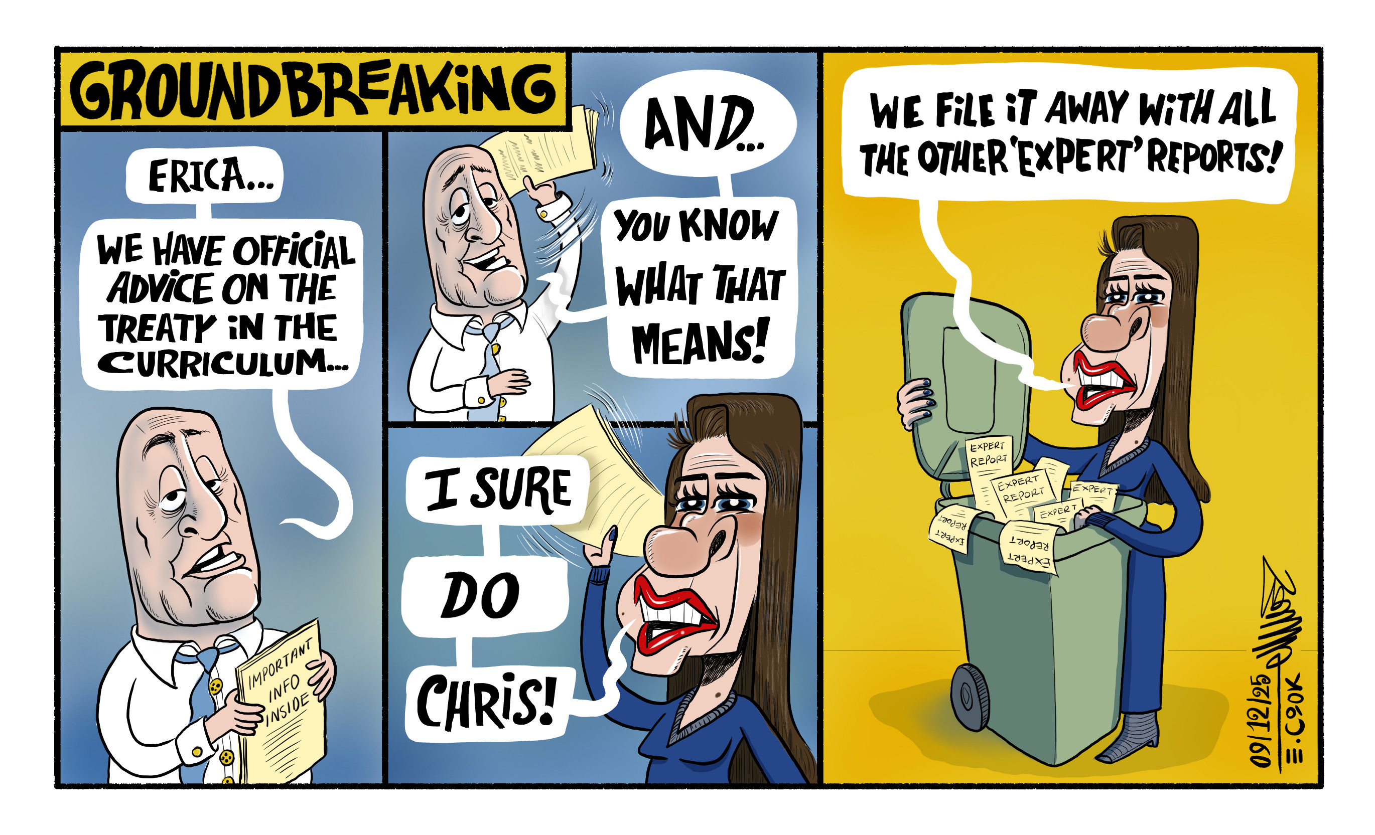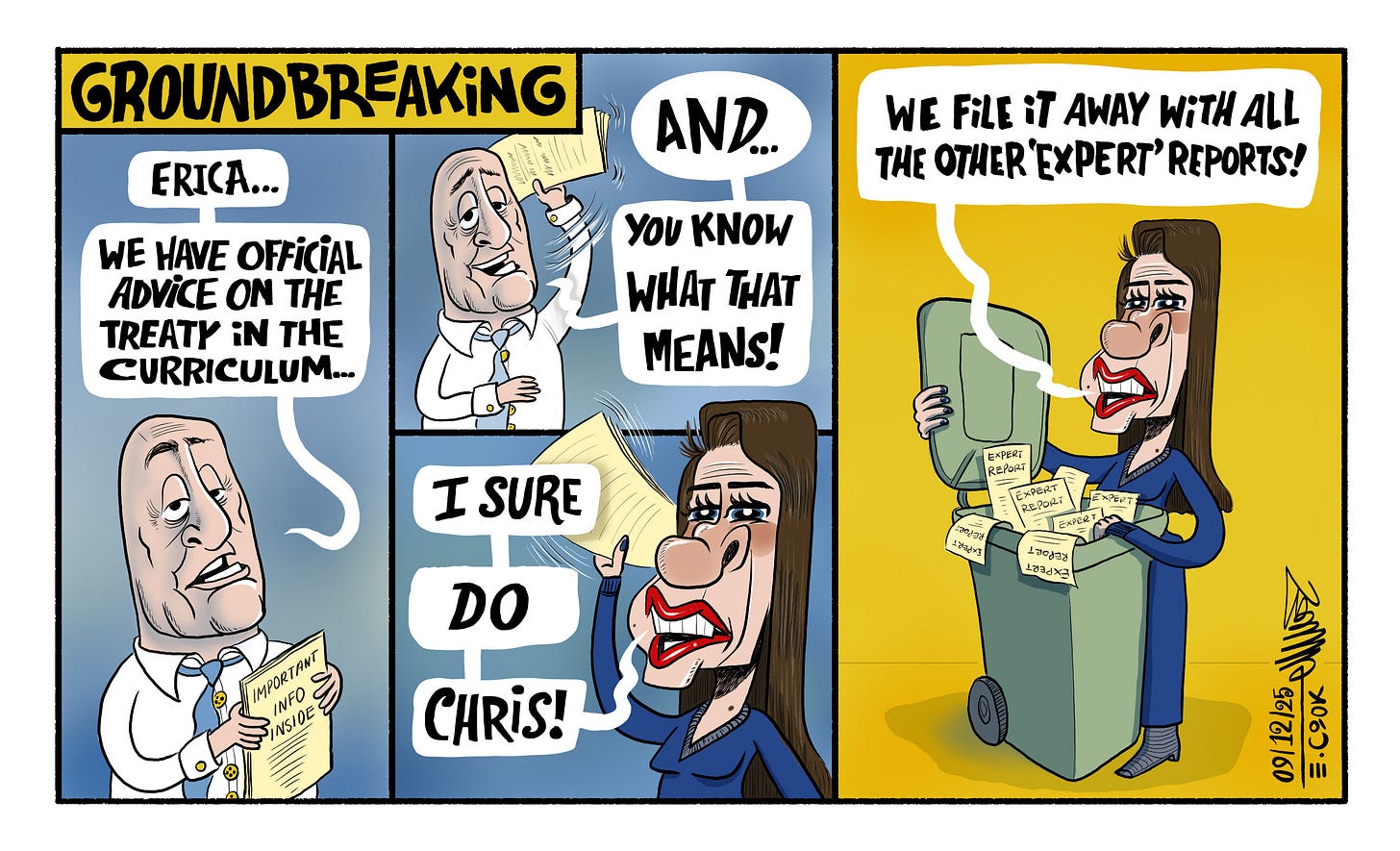 Luxon is in the 1st holding a report that says ‘IMPORTANT INFO INSIDE’. He says, “Erica... we have official advice on the Treaty in the curriculum...” the 2nd panel has him holding the report up in his hand about to throw it to Erica, “AND... you know what that means!”