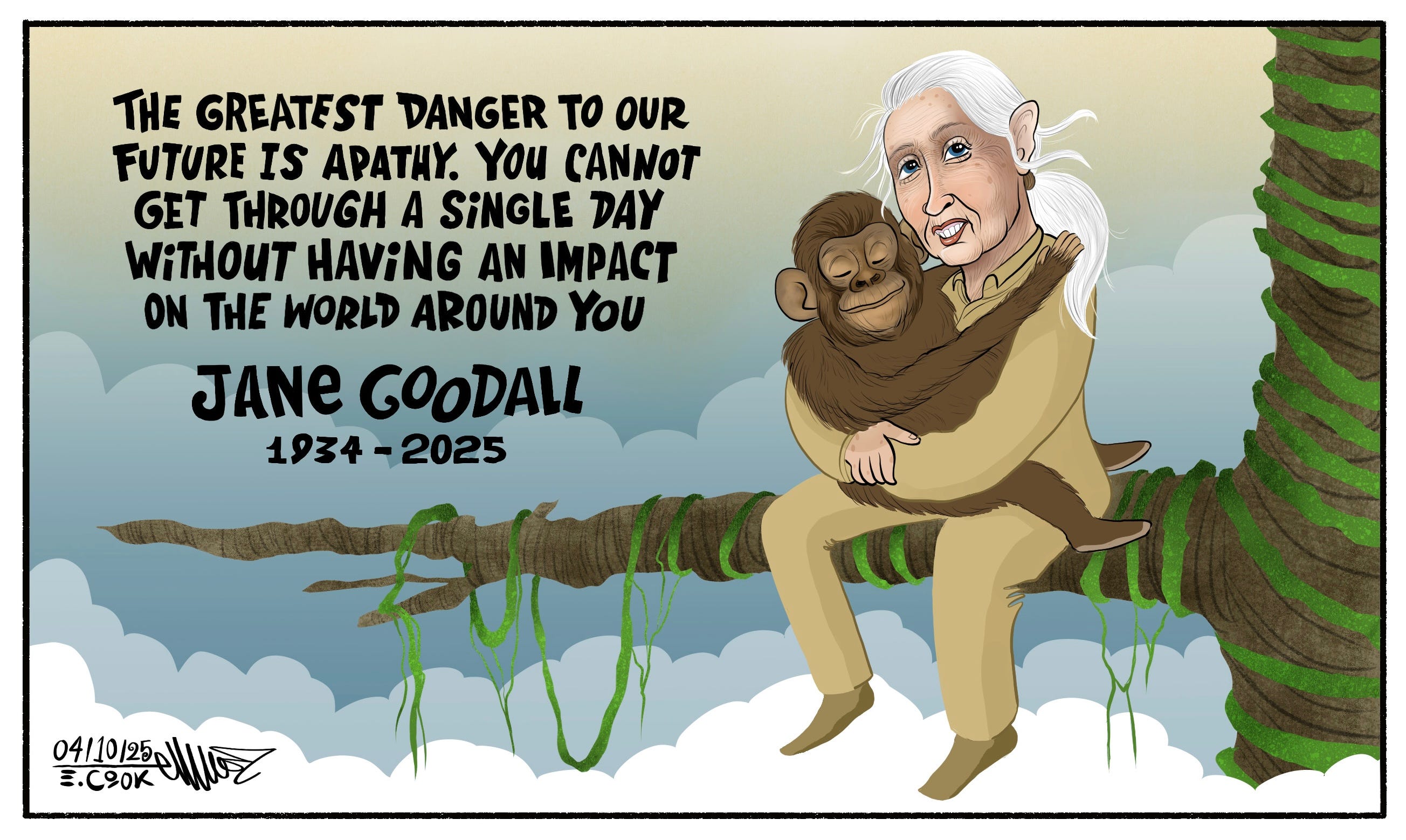 Cartoon. Jane Goodall is sitting on the branch of a jungle tree. She is holding her favourite chimpanzee of all time called David Greybeard. There are vines wrapping around the branch and clouds to denote heaven. The quote, “The greatest danger to our future is apathy. You cannot get through a single day without having an impact on the world around you. Jane Goodall 1934-2025.