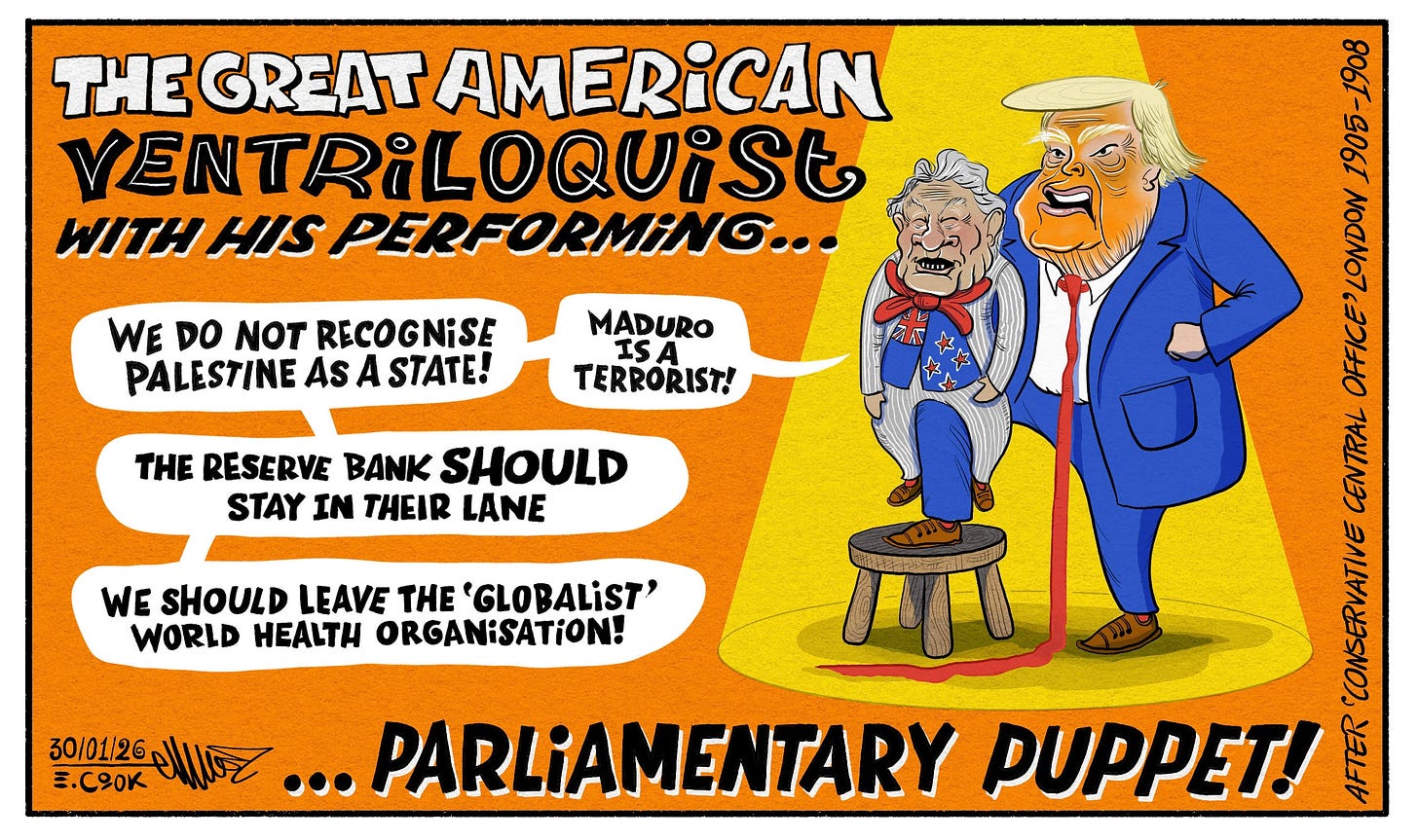 We have Trump and Winston Peters on a small stage. Trump has Winnie on his knee as his puppet. Trump is channeling his words through Winnie: