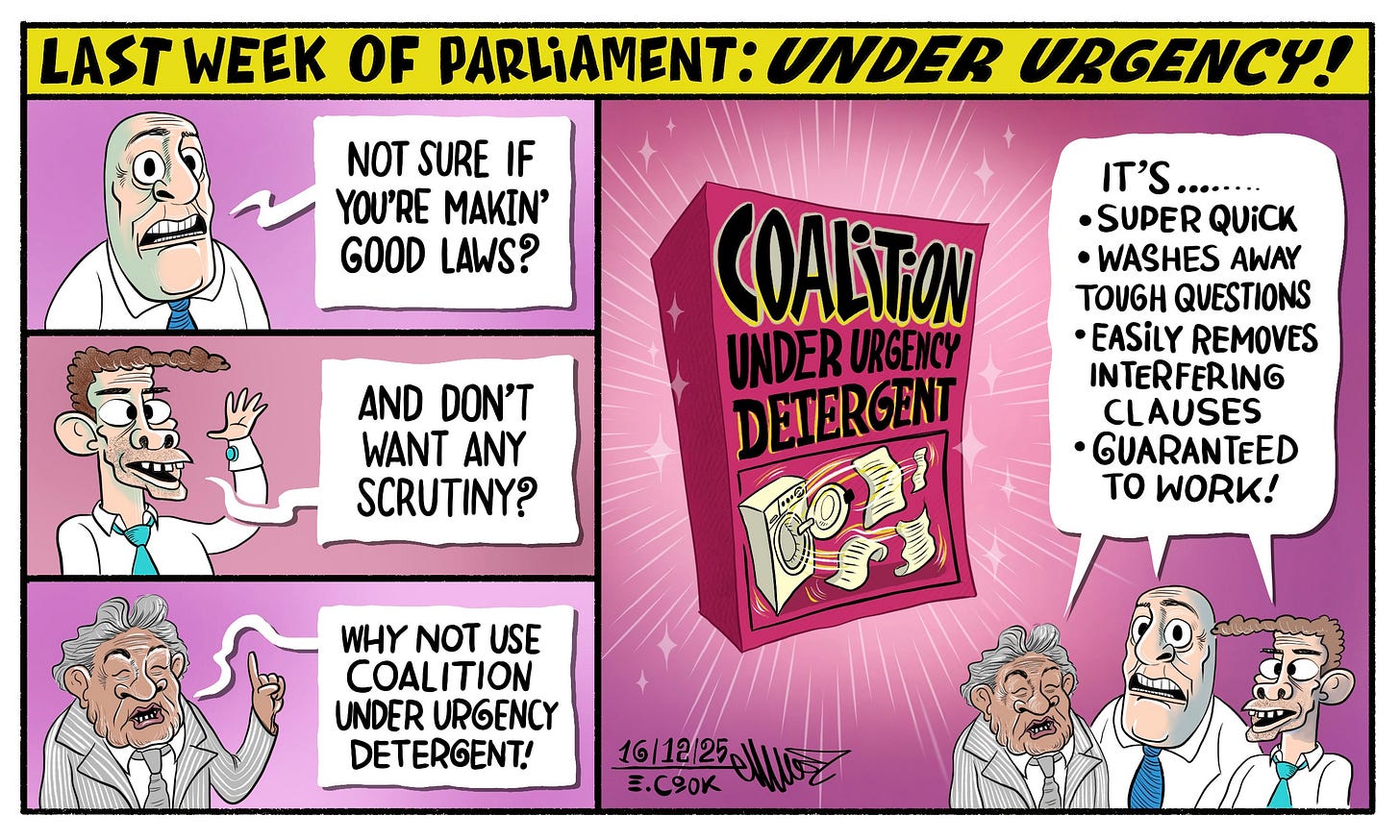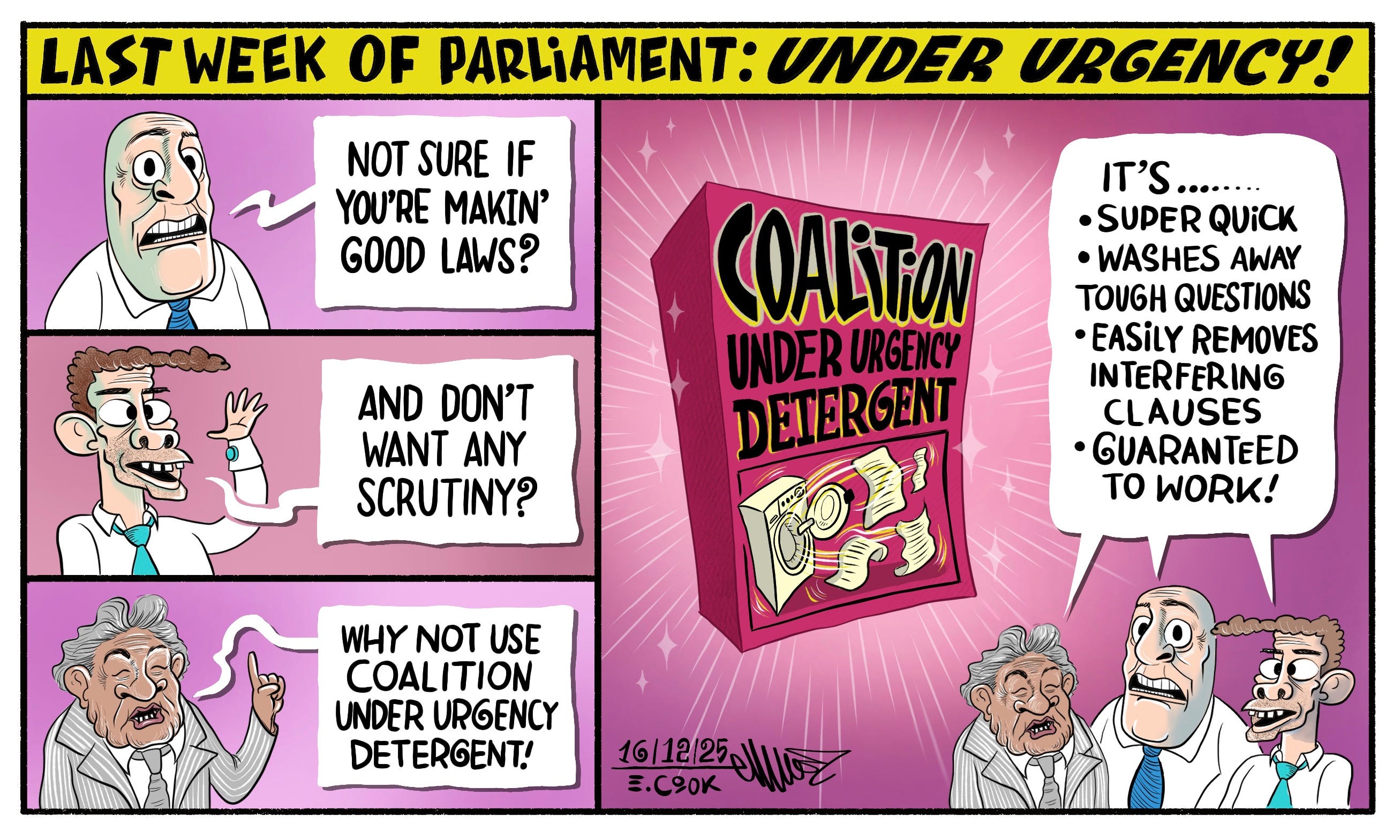 4th has all three of them with a huge box of sparkling detergent with the words - COALITION UNDER URGENCY DETERGENT - and a little washing machine pumping out parliamentary bills. They three are saying, “it’s...... Super quick, washes away tough questions, easily removes interfering clauses, guaranteed to work!